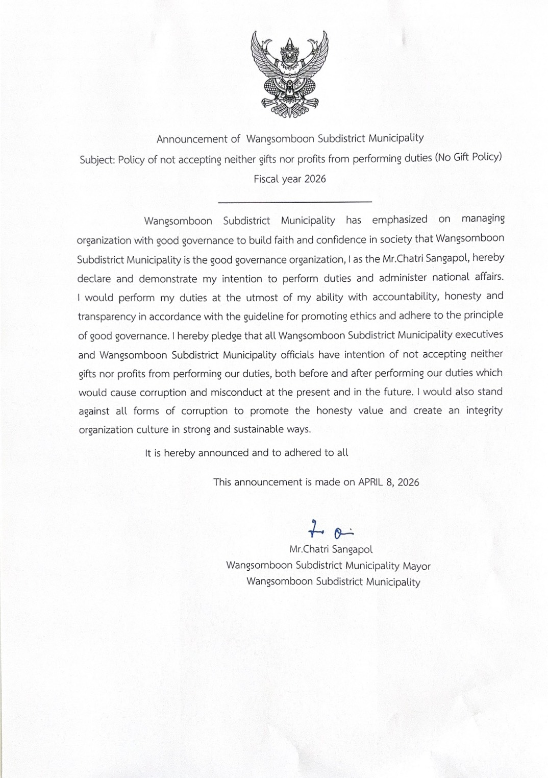 ประกาศเทศบาลตำบลวังสมบูรณ์ เรื่อง นโยบายการไม่รับของขวัญและของกำนัลทุกชนิดจากการปฏิบัติหน้าที่(NO Gift Policy)ประจำปีงบประมาณ พ.ศ.2569